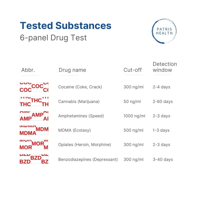 - Tested drugs: COC, THC, AMP, MDMA, MOR/OPI, BZD