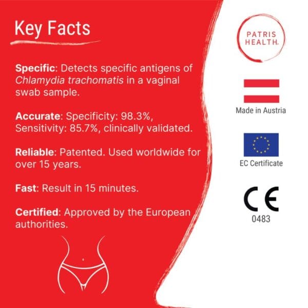 The at-home Chlamydia Test fully complies with the European directive 98/79/EC on the in-vitro diagnostic medical devices. It is CE certified for home use by the Notified Body 0483.