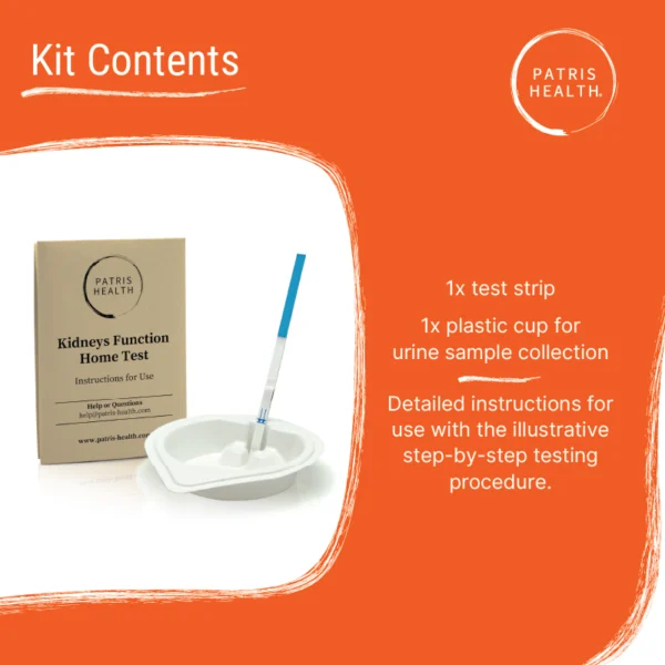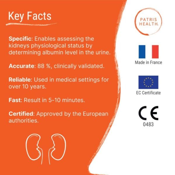 The Patris Health® Kidney Function Home Test is a certified self-test for detecting albumin (microalbumin) in the urine.
