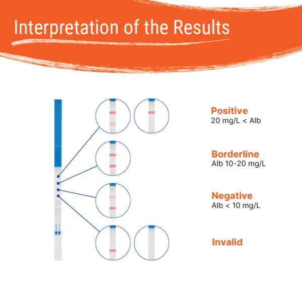 Our self-test for microalbuminuria detects a very low concentration of albumin in the urine (10 μg/ml). Measurement of urine albumin is vital for detecting kidney disease and monitoring kidney health.