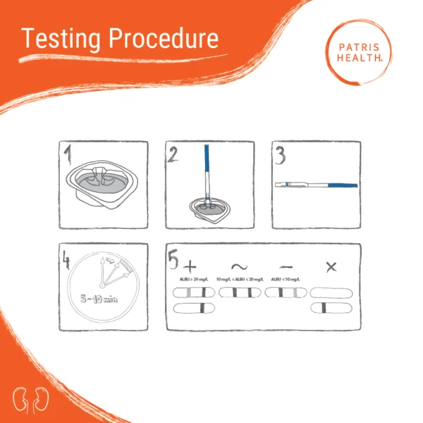 Ilustration of the testing procedure of the Patris Health Kidneys Function Home Test (Albumin)